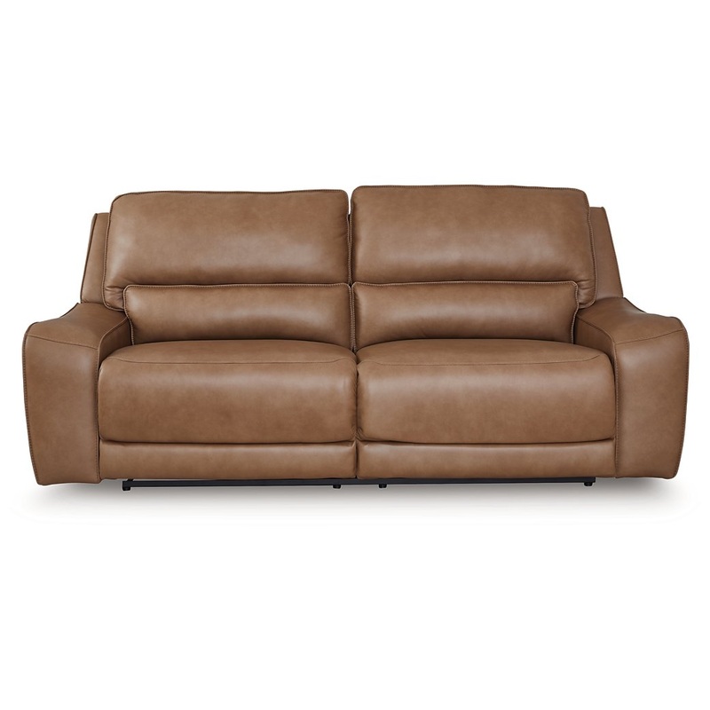 Live and lounge luxuriously. This power reclining sofa brings an ultra-stylish flair to your homes central hub. Its seating area is wrapped in top-grain leather in a rich caramel coloration, giving you a trend-right look made all the better with high-quality materials. And with the simple push of a button, you can recline or adjust the headrests to find your ideal comfort position.