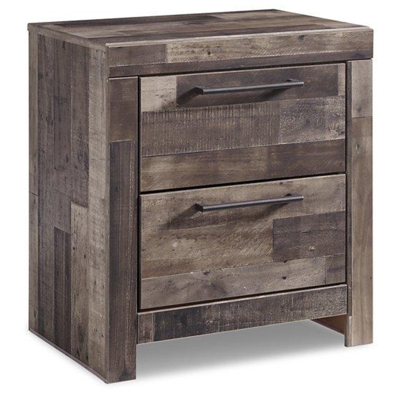 Modern yet hefty. This nightstand makes an urban eclectic statement. Seasoned raw wood look merges with the clean lined design we love today. Muted rustic finish over replicated pine grain maintains its authenticity. Roomy drawers are flanked with attractive framed front and pilasters. Handles with antiqued gunmetal finish complete this beauteous look with easy to pull function.