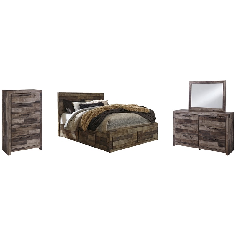 Derekson Queen Panel Bed with 4 Storage Drawers with Mirrored Dresser and Chest