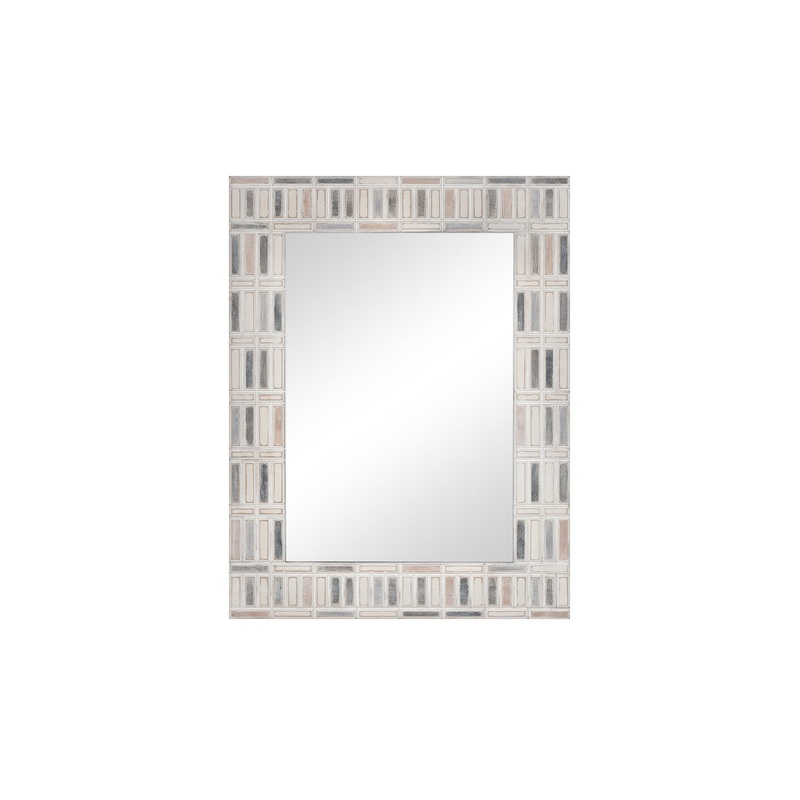 The Derse Wall Mirror is a rectangular mirror with a wide frame featuring a mosaic of neutral rectangles in washed white, grey, blue and blush. The look is ideal in a variety of environments.