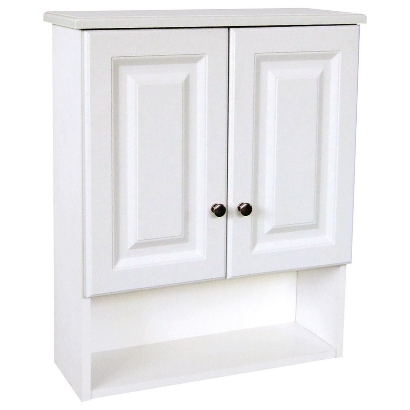 The Design House Wyndham White Bathroom Wall Cabinet features a white finish with satin nickel square knob hardware. This product has a rustic shabby chic design, meshing modern construction with vintage aesthetics, and has a cam lock connector for fast an