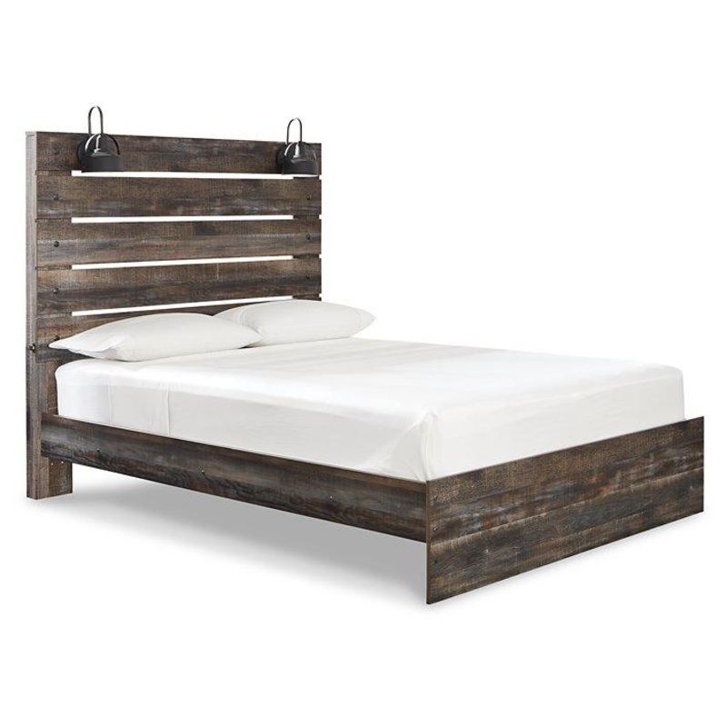 When merged in just the right way, rustic and industrial styles can make one happy marriage. Case in point: this queen panel bed. A refined take on barn board beauty, its complex, replicated wood grain showcases hints of burnt orange and teal tones for a sense of weatherworn authenticity. Love to read in bed? Youre sure to find the pair of retro-chic light sconces and USB plug-ins on the open-slat style headboard such a bright idea. Mattress and foundation/box spring available, sold separately.
