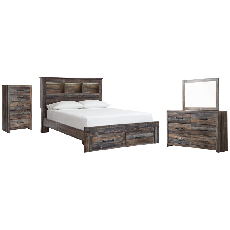 This queen-size bookcase bed with storage, dresser, mirror and chest of drawers is a refined take on barn board beauty. Its complex, replicated wood grain showcases hints of burnt orange and teal tones for a sense of weatherworn authenticity. Three open cubbies lined with a dimming LED light strip keep bedtime reads top of mind. Double drawers at the foot of the bed come in mighty handy. The dresser with six smooth-gliding drawers and chest with five smooth-gliding drawers are lined with faux linen laminate with industrial dark-tone hardware completing this rustic and industrial style bedroom. Mattress and foundation/box spring available, sold separately.