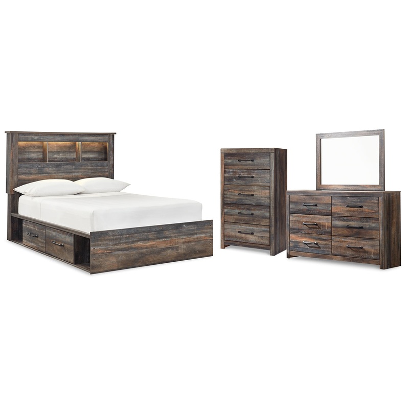 This full-size bookcase bed with storage, dresser, mirror and chest of drawers is a refined take on barn board beauty. Its complex, replicated wood grain showcases hints of burnt orange and teal tones for a sense of weatherworn authenticity. Three open cubbies lined with a dimming LED light strip keep bedtime reads top of mind while underneath the bed is four smooth-gliding drawers and four open cubbies that accommodate casually cool storage bins. The dresser and chest with smooth-gliding drawers lined with faux linen laminate and industrial dark-tone hardware complete this rustic and industrial style bedroom. Mattress and foundation/box spring available, sold separately.