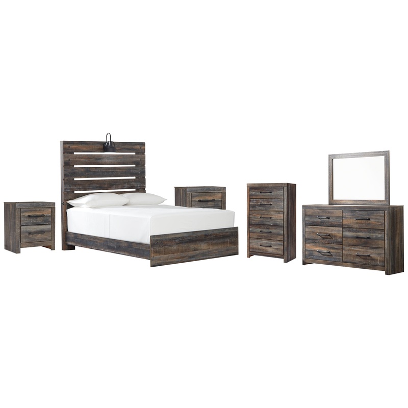 This full-size panel bed, mirror, dresser, chest of drawers and two nightstands is a refined take on barn board beauty. Its complex, replicated wood grain showcases hints of burnt orange and teal tones for a sense of weatherworn authenticity. Love to read in bed? Youre sure to find the pair of retro-chic light sconces and USB plug-ins on the open-slat style headboard such a bright idea. The dresser, nightstand and chest with smooth-gliding drawers lined with faux linen laminate and industrial dark-tone hardware complete this rustic and industrial style bedroom. Mattress and foundation/box spring available, sold separately.
