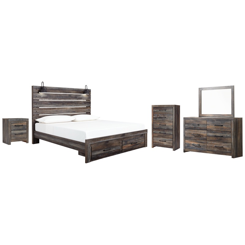 Drystan King Panel Bed with Storage with Mirrored Dresser, Chest and Nightstand