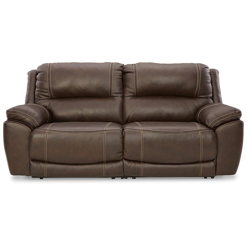 Load up on comfort in a cool, clean-lined and contemporary way with this power reclining loveseat in chocolate brown. Rest assured, the leather match upholstery is enriched with a pebble grain effect for authentic appeal and enhanced with jumbo stitching for dramatic contrast. It features a one-touch power control with adjustable positions, along with an Easy View adjustable headrest that allows a primo view of the TV even when you’re reclined. Extended ottomans provide extra length for leg comfort. A zero-draw USB plug-in at your fingertips lets you charge up as you chill out.