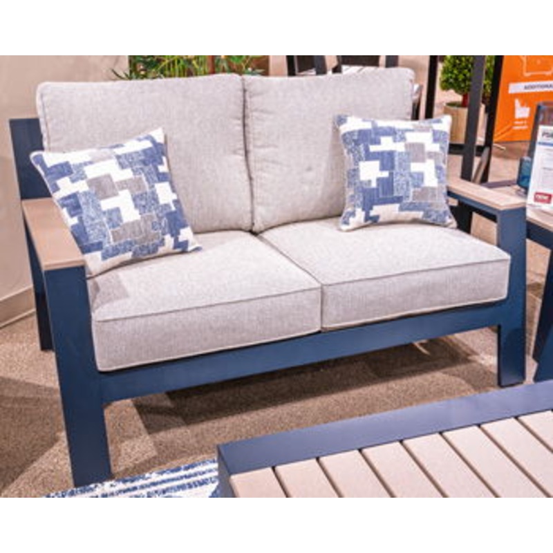 Easy-breezy beauty, made to withstand the elements. This outdoor loveseat makes a serene statement on your deck or patio with its soothing shade of blue and contrasting wood-look arms. A cushioned seat keeps you comfy as you lounge. And with durable materials providing added longevity, this loveseat is a smartly-stylish addition to your outdoor oasis.