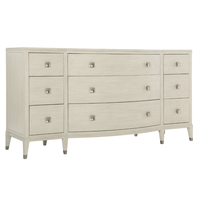 Wood bead around top.Nine drawers.Center drawers have bowed fronts.Metal ferrules - excluding center back legs.Adjustable glides.The East Hampton dresser maintains a minimalist sensibility, though its elegant lines and refined proportions reveal a subtle s
