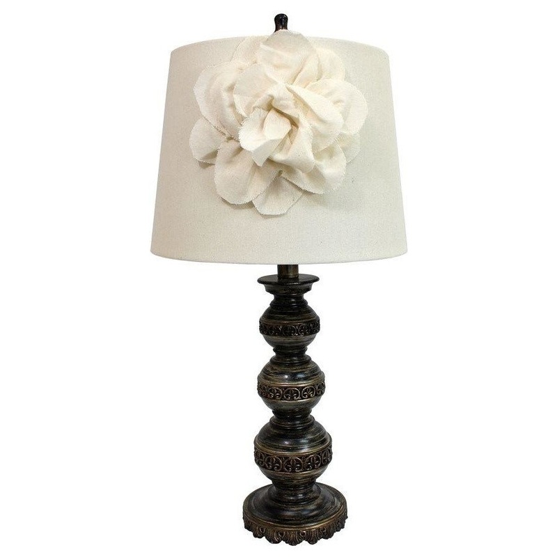 Elegant Designs Aged Bronze Stacked Ball Lamp with Couture Linen Flower Shade. This aged bronze table lamp with its three stacked ball base and linen shade with boutique flower adornment will add style and pizzazz to any room. Perfect for living rooms, bed