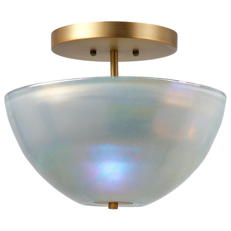 The iridescent opulence of mother-of-pearl has been inspiring artisans for millennia. In this semi flush mount, the subtle beauty of that natural material is recreated in metallic glass. We keep the lines simple, and pair it with burnished antiqued brass hardware to complement and enhance the warmth of the glass. As the handblown pieces are created one at a time, no two will be identical. Each is a unique work of art. Professional installation is recommended. Available separately in White.