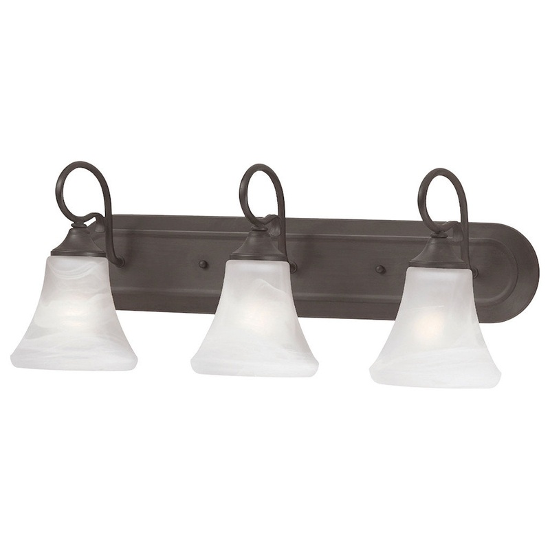 Three light bath vanity in painted bronze finish with alabaster style glass shades. Can be hung with glass facing up or downwards. Hardwired only. Three 100 watt incandescent or led equivalent bulb required, not included. -Bulb Type: E26 Medium -Number of