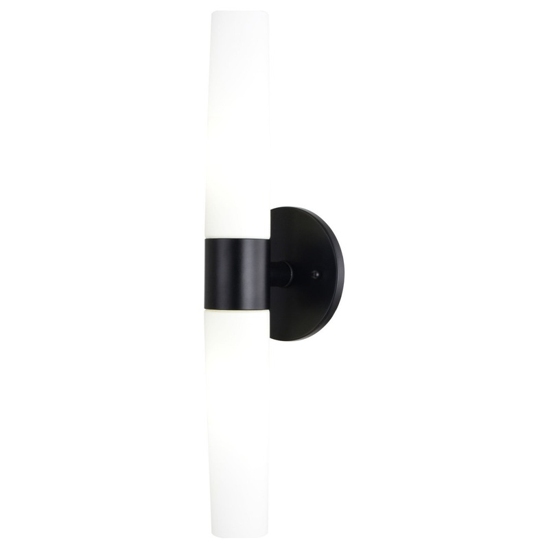 The simplicity and elegance of the Elliot collection is perfectly designed to blend with any contemporary interior at an affordable price. Tapered cylinders of frosted opal glass extend along a circular matte black wall plate, creating a streamlined form. The fixture, with its sleek design and bright illumination, speaks to a sense of functionality as well as style. Mount these versatile fixtures either horizontally or vertically for the ideal look in your bath, hallway or other living areas of your home. Lighting tip: for an even light dispersion, the Elliot will be maximized when paired with two long, tubular bulbs.