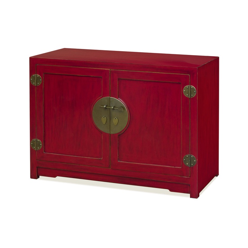 -White glove service availableWith simple silhouette and clean lines, this Elmwood vanity cabinet is inspired by the Chinese Ming Style aesthetic. A matte red finish and gold brass hardware on the cabinet are complemented by the contrasting porcelain sink vessel, which features elegant Chinese calligraphy along the exterior and interior. The faucet comes in shiny chrome finish. One removable shelf is provided behind the doors. For installation convenience, the cabinet comes with removable panel in the back measuring 19″W x 10″H.