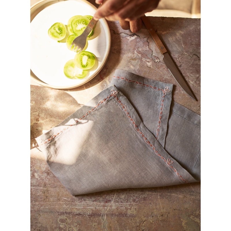 - A set of two beautifully embroidered blue linen napkins - Coloured in a carefully chosen gentle Powder Blue- Featuring a playful pink border that's embroidered by hand- A sustainable alternative to paper napkins- For adding some subtle colour to the tabl