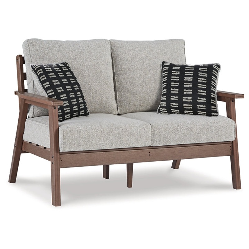 Get back to nature with the relaxed styling of this outdoor loveseat with cushions. Crafted of MEGA-TUFF HDPE material, it combines the exceptional durability and weather resistance you need with the wood look you love. Rest assured, the cushions are wrapped in comfortable and carefree Nuvella fabric, leaving you plenty of time to sit back and smell the roses.