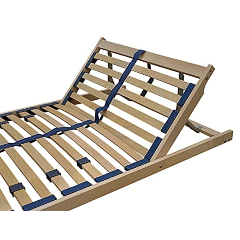 Dettagli: Rete a doghe di alta qualit in legno massello.Con zona pelvica regolabile individualmente nel grado di durezza per alleviare l’area lombare.Comfort a 5 zone per un adattamento ottimale a chi dorme.Per un piacevole relax e rigenerazione di notte.Con poggiatesta regolabile per supporto per il collo e supporto per la lettura.Dimensioni:Telaio doghe per materasso 120×200 cmDoghe montate su cappucci duo (il colore pu variare)Stecche di circa 3,5 cmDistanza tra le stecche circa 4 cmAltezza telaio circa 7,5 cmRegolazione zona centrale.Adatte a tutti i tipi di materassi.Consigliate per peso corporeo fino a 100 kg.Materiale: compensato nordico.Telaio lungo: compensato 12 volte incollato, non trattato.Telaio in legno massiccio, betulla o faggio, non trattato.Modanature: legno molato incollato 6 volte, non trattate.Per un sonno sano e riposanteLa consegna smontata, imballata in una scatola facile da installare con istruzioni di montaggio illustrate.Il numero di strisce potrebbe differire dall’immagine.