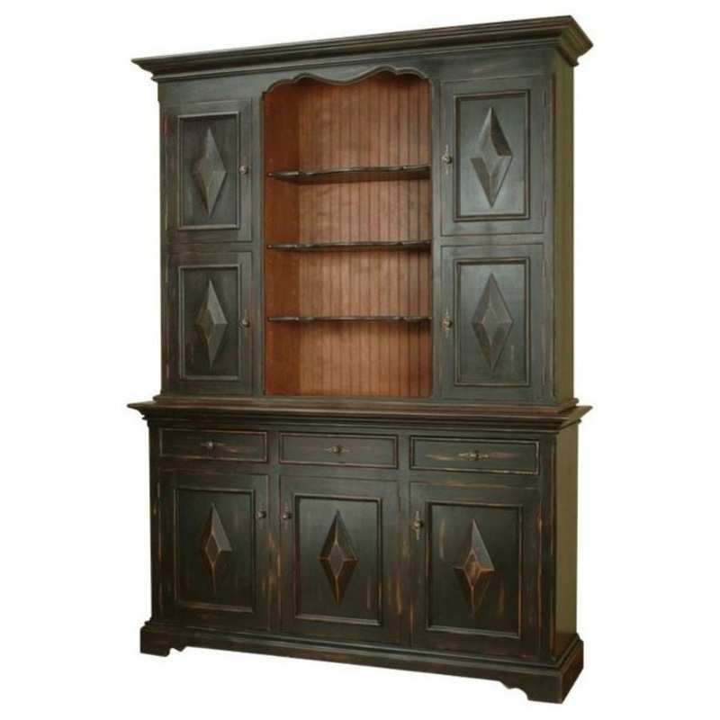 Finished in distressed black or antique white with an American Colonial interior and raised diamond panels, the Fairfield Hutch is elegant and classic. Features an open display with 3 adjustable shelves and a beautiful scalloped edge with plate grooves on