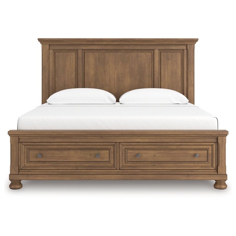 A relaxed take on casual traditional design, this king panel storage bed strikes a comfy pose with a classic sensibility. Its timeless design and chestnut brown wood tone create a welcoming retreat tailored to your laid-back lifestyle. Metal knobs in an aged pewter color subtly dress up footboard drawers packed with storage possibilities. Now theres a bed with staying power.