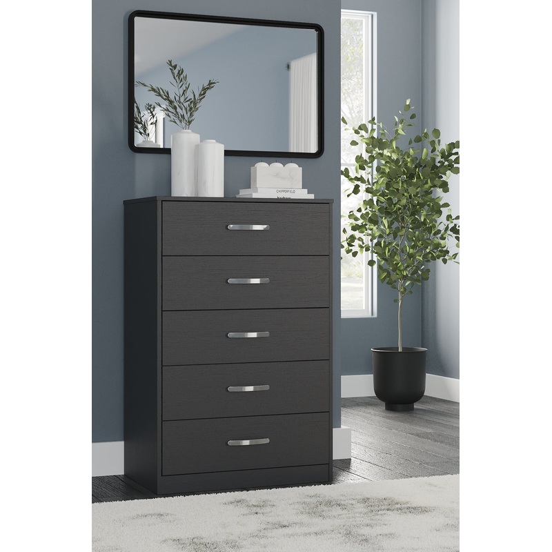 Practical and attractive, this chest of drawers blends seamlessly with modern decor and makes a smart addition to a bedroom. Five spacious drawers will keep your clothes neat and organized. Sleek metal pulls in a brushed nickel-tone finish add to the streamlined aesthetic. Combine with other pieces in the collection to create a room thats smart and stylish.