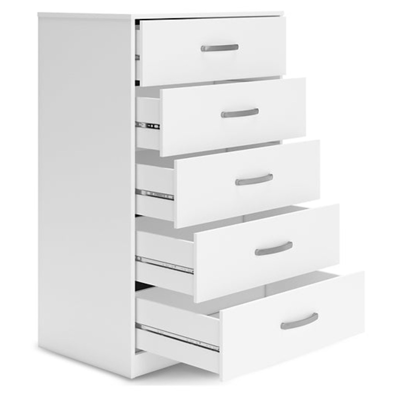 This chest of drawers has simple lines and contemporary styling, allowing it to blend seamlessly with any decor. Five spacious drawers slide easily on metal ball bearings and can be used to keep your clothes neat and organized. Sleek metal pulls in a brushed nickel-tone finish add to the streamlined aesthetic. Combine with other units in the collection to create a room thats smart and stylish.
