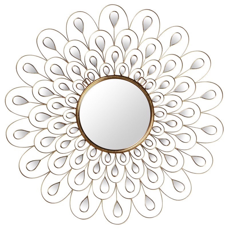 This 36" x 36" stunning wall mirror is constructed with a round glass mirror surrounded by many smaller acrylic mirrors to appear like a sunflower. Wrapped around the mirrors is a metal frame with handmade gold foil that intensifies the design of the sunfl