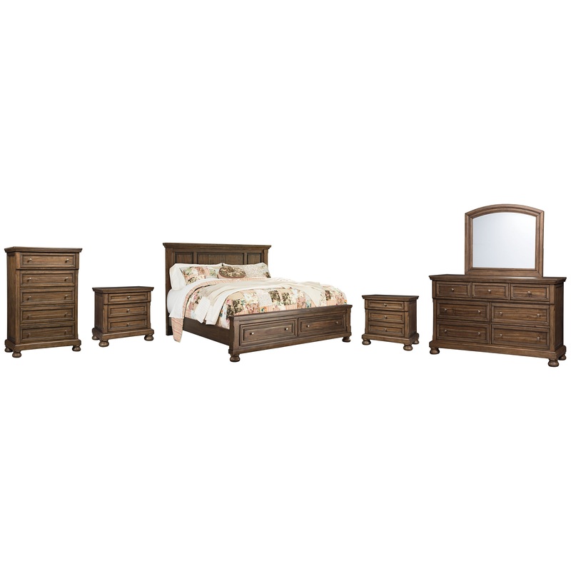 Flynnter Queen Panel Bed with 2 Storage Drawers with Mirrored Dresser, Chest and 2 Nightstands