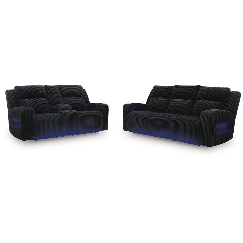 Trend-right style, meet irresistible modern function. Your living room gets a cozy-cool upgrade with this power reclining seating package. Curl up in its ultra-chic corded fabric and recline with one-touch controls. Is it movie night or game time? With ambient LED lighting, this set transforms from a serene relaxation spot to an entertainment hub. USB charging, cup holders and storage cutouts make lounging all the more convenient.