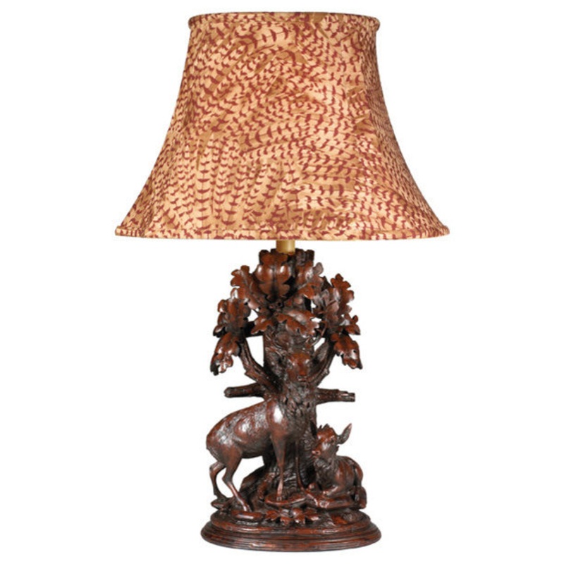 -This lovely Forest Monarch Lamp is a rustic style burlwood forest monarchs lamp, pheasant feather pattern fabric, 3 way 100 watt max. -It requires one bulb, which is not included. -It measures 21 inches wide, 18 inches deep, and 33 inches high, and is mad