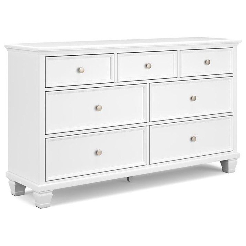 This dresser exudes timeless casual design that’s ready to define your personal space. Its clean, contemporary white finish, framed drawer fronts and round metal knobs easily adapt to a variety of interiors. Featuring seven storage drawers with dovetail construction and traditional tapered feet, this piece is sure to bring elegant simplicity to your bedroom.