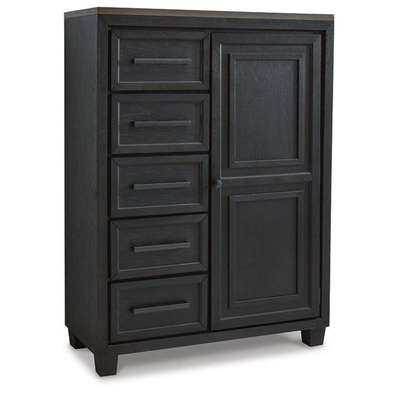 This door chest is casual contemporary style simply done right. Its two-tone color scheme features a rich brushed black main color accented with a beautiful dusty grayish brown wood tone. And there’s plenty of storage to accommodate your wardrobe needs with ease. The dresser has 5 soft-close drawers, and behind the door you’ll find pull-out trays for shoes or other accessories, along with shelving for bulky items.