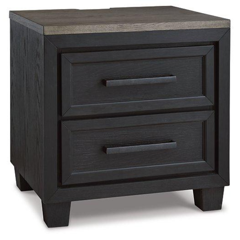 This nightstand is casual contemporary style simply done right. Its two-tone color scheme features a rich brushed black main color accented with a beautiful dusty grayish brown wood tone. Two drawers with sleek black pulls offer plenty of storage for your bedside essentials. The nightstand marries tech and clean-lined design, with a dual USB charging port along the upper back edge to keep your devices powered all evening long.