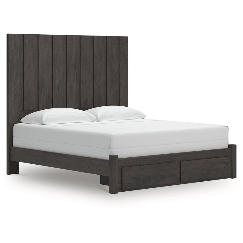 Find serene simplicity in the clean lines and dark neutral tones of this king panel storage bed. Its a sincere approach to modern elegance, giving you high style at a great value. Short on storage? Smooth-gliding drawers in the footboard keep clutter neatly tucked away. Vertical planks decorate the generously scaled headboard to give the illusion of additional height, polishing off the piece in grand fashion.