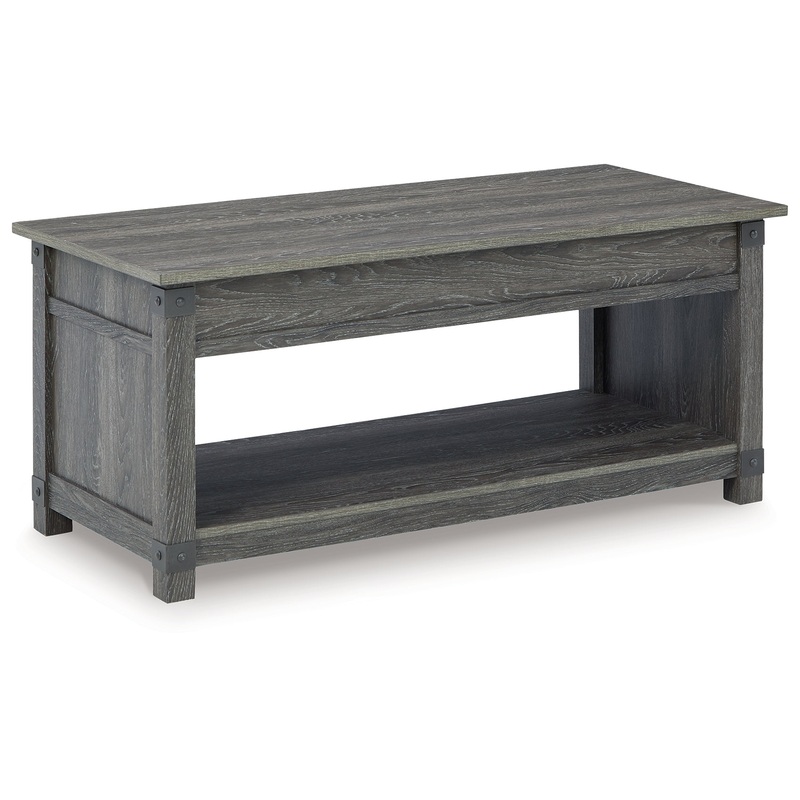 Open the door to modern farmhouse style with this lift-top coffee table. The beautiful woodgrain look and classic crossbuck metal accents are a cool touch, while the lower shelf provides surface space for fashionable home accessories. Sporting a gray replicated wood grain effect, its handy spring-loaded mechanism brings the tabletop closer to you. This versatile table makes it easier than ever to eat, work or play from the comfort of your sofa.