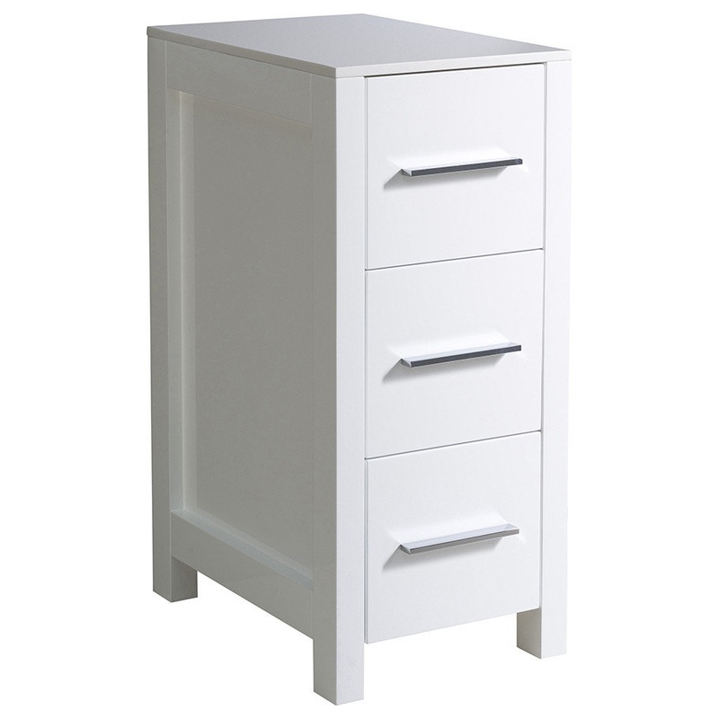 This side cabinet comes in a white finish. It has 3 spacious drawers and a sleek ceramic countertop. -Dimensions: 12"W x 17.75"D x 28.13"H -Materials: Plywood w/ Veneer -3 Soft Closing Drawers -Perfect Match For All Fresca Torino "White" VanitiesModel # (M