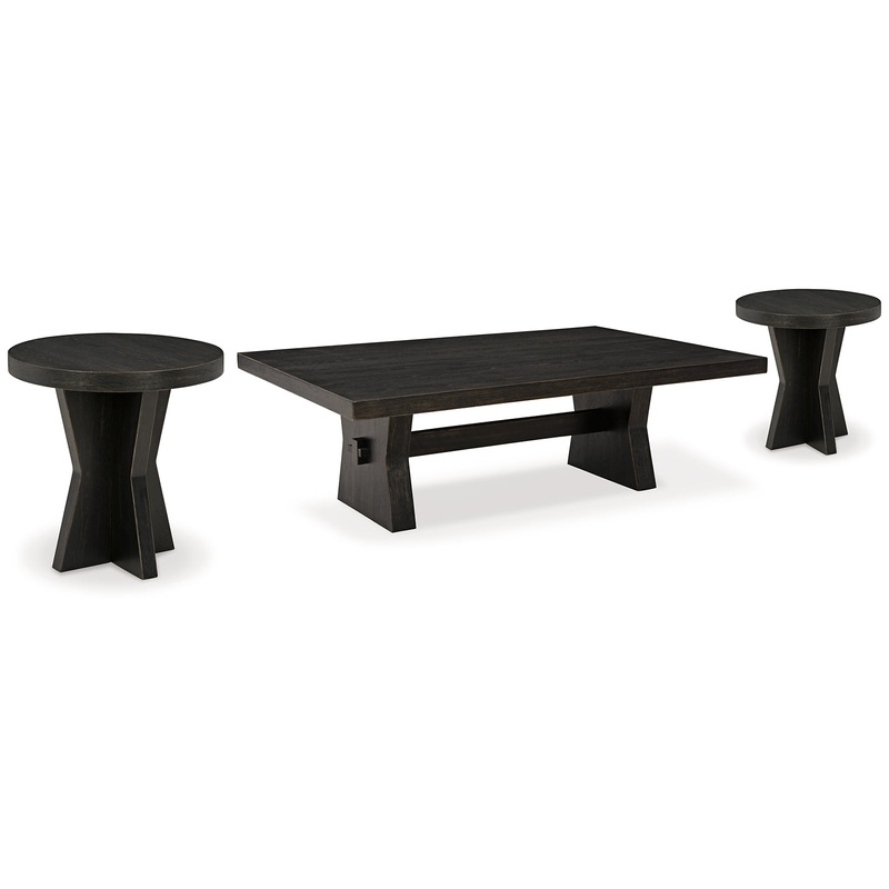 This coffee table brings a rustic vibe to urban contemporary design. Its a modern approach to natural beauty, with an aged black finish defining a thick top. And the stunning simplicity of its color palette allows you to seamlessly coordinate this table with your existing decor. 2 Matching end tables included.