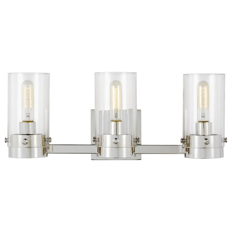 Garrett three light vanity fixture in polished nickel provides abundant light for your bath vanity, while adding a layer of today's style to your interior design. Garrett from Chapman and Myers for Generation Lighting features cylindrical Clear Extruded Gl