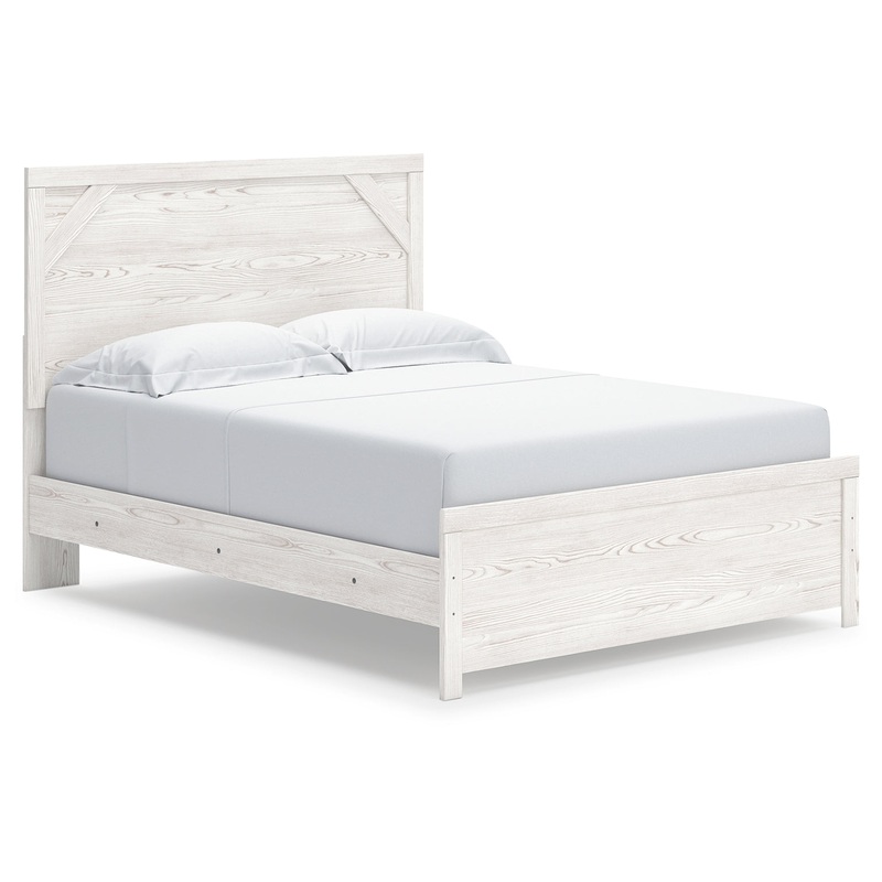 Cool, clean and casually modern. This queen panel beds wispy whitewash finish sets the tone for your calming sanctuary. Framed elements and cross-brace accents add dimension and authenticity to the beds simply stunning profile.