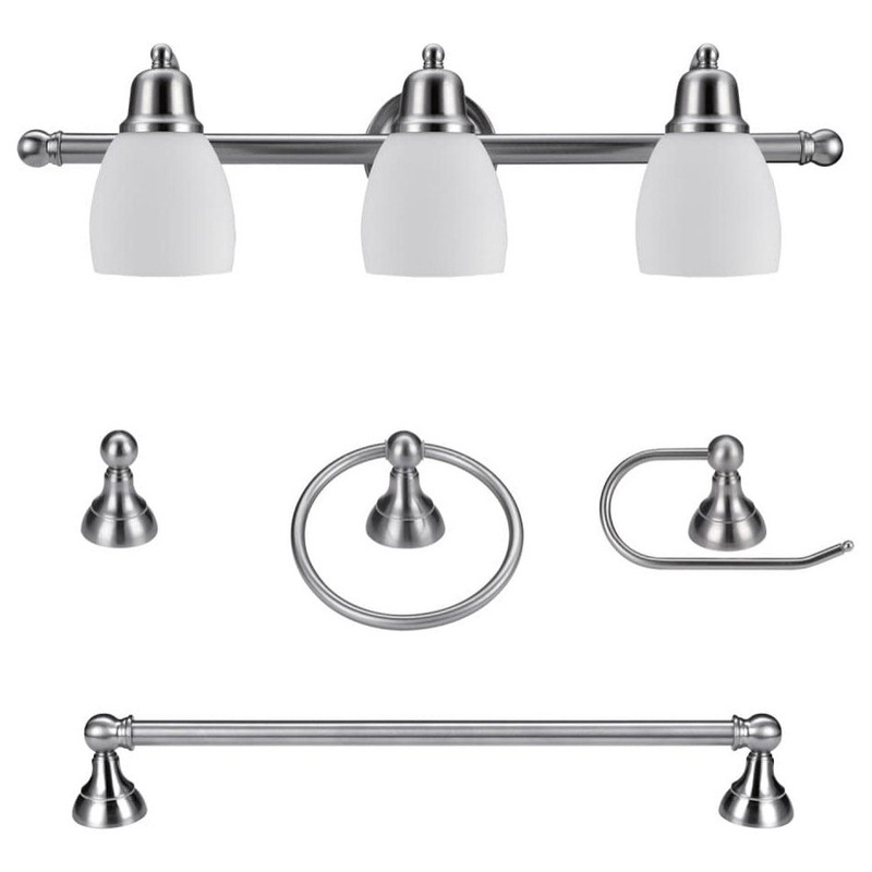 Features: Includes matching 3 light vanity light, towel bar, toilet paper holder, towel ring and robe hook 3 medium (E26) 60 watt bulb(s) required Rated for use in damp locations Dimmable light fixture Easy installation with all hardware and mounting inclu