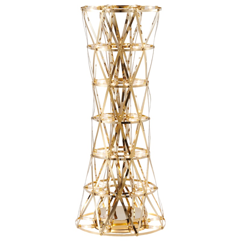 This modern and stylish table lamp features a unique cage-like design with a gold metal frame. The minimalist design creates a dramatic and eye-catching effect, perfect for adding a touch of contemporary flair to a living room or bedroom.
