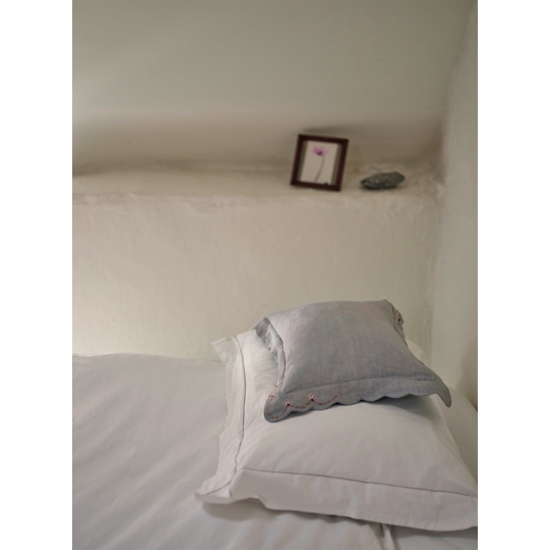 - A scalloped blue scatter cushion with embroidered details- Woven from pure linen in a pale blue tone- Featuring hand-embroidered floral motifs - Comes with an ethically sourced feather inner- Has a discreet zip closure at the back to remove for washing -