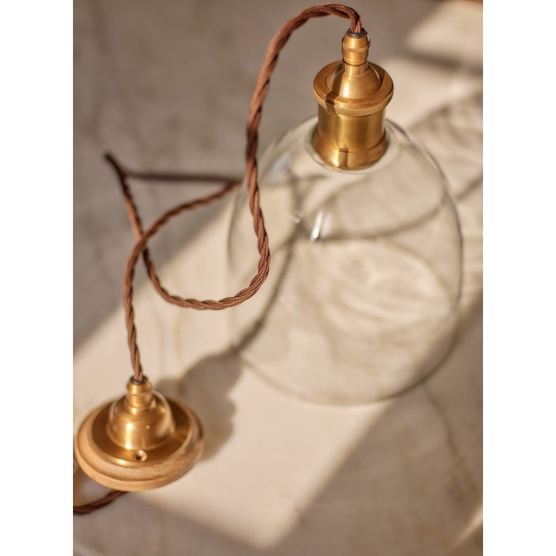 - An elegant domed hand-blown glass pendant with bell-like contours- Subtle ripples in the glass and a rolled edge celebrate the hand-blowing process - Hangs from an oak and brass ceiling rose featuring a heritage-inspired chocolate-toned twisted cord- A b