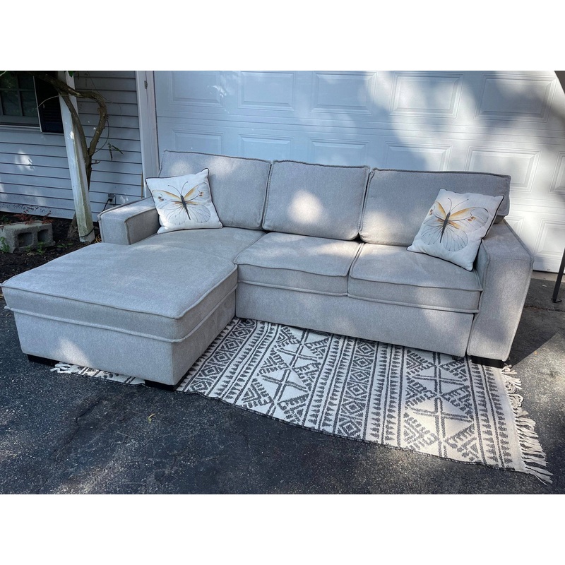 Gray 2 piece sectional with left-facing chaise, storage, and pop-up sleeper.About 2 years old, its in excellent condition with No Rips, No Stains, No Damage, and No smoke. It is pet friendly, but has been professionally cleaned to freshen it up for a new h