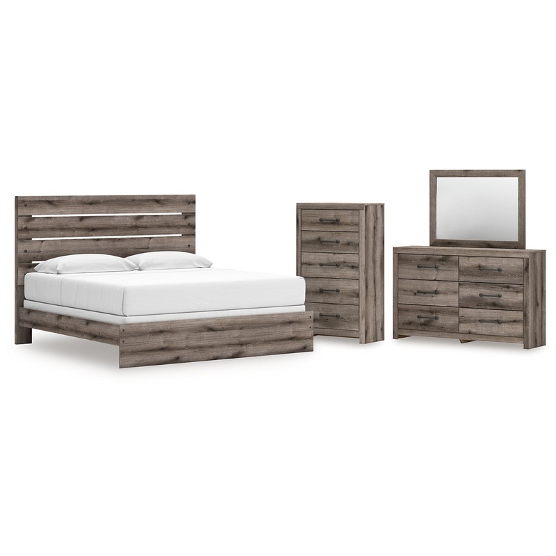 Graystorm King Panel Bed with Mirrored Dresser and Chest