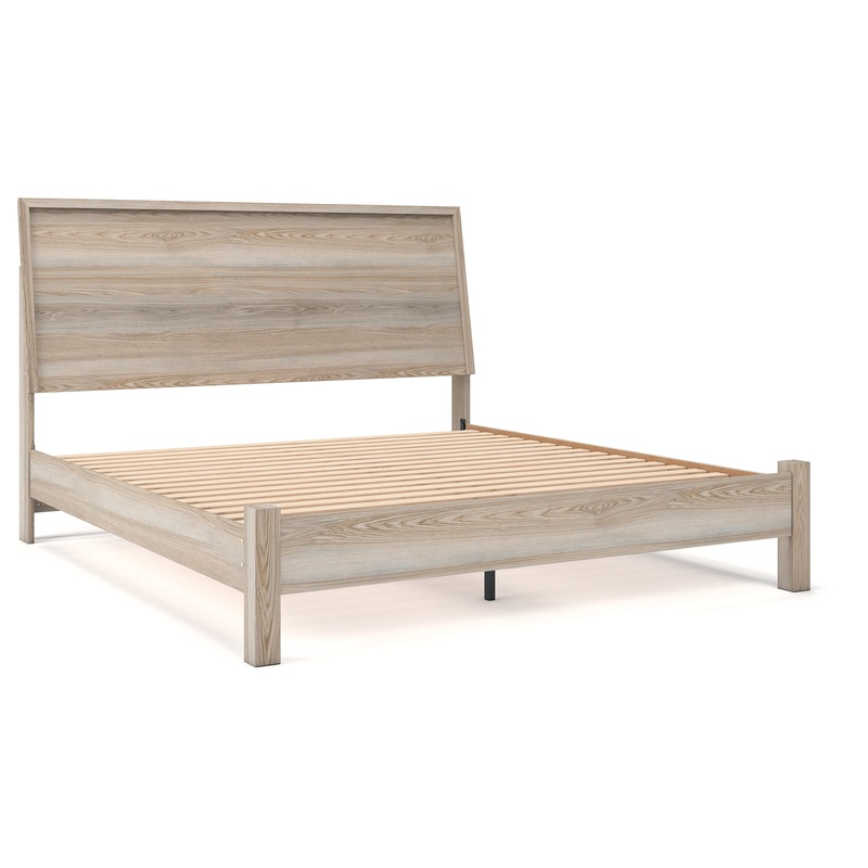Modern meets neutral and sophisticated in this king panel bed. Its clean lines and open slat headboard wake up your bedroom with eye-catching appeal. The natural finish and subtle replicated wood grain speak casual simplicity, creating a smart and stylish