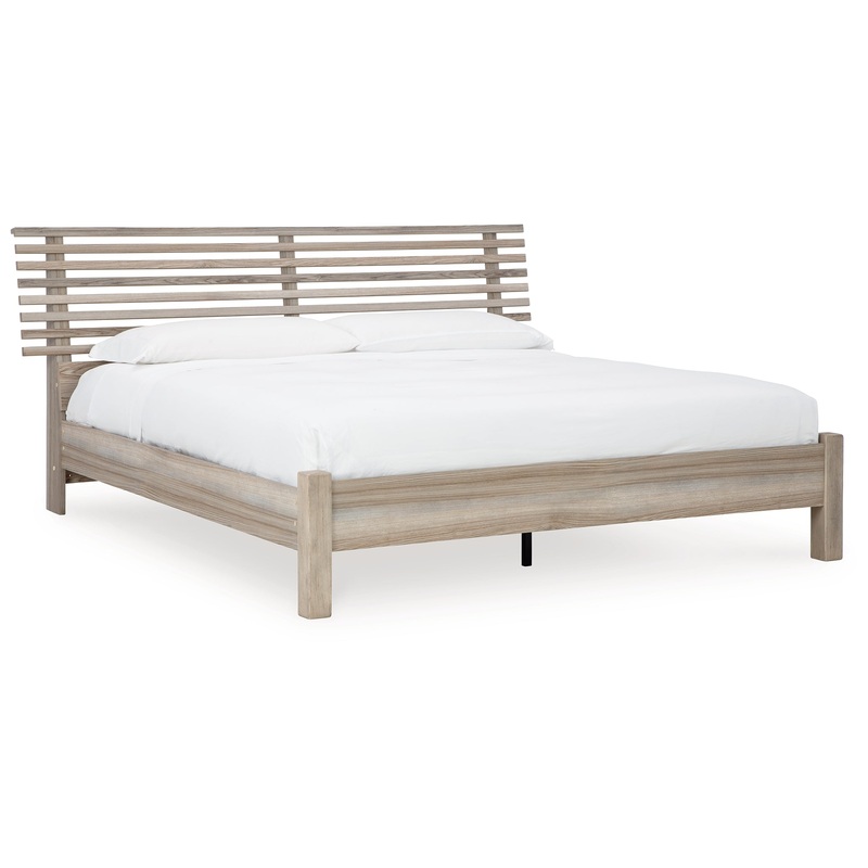 Modern meets neutral and sophisticated in this king panel bed. Its clean lines and open slat headboard wake up your bedroom with eye-catching appeal. The natural finish and subtle replicated wood grain speak casual simplicity, creating a smart and stylish