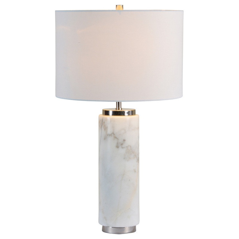 The stately design of this modern table lamp feels statuesque on tabletops throughout the home. A white marble lamp base adds the perfect element of antiquity without feeling old fashioned, thanks to a satin nickel-plated accents and off-white linen drum lampshade. Soft gray veining throughout the base makes this natural stone lamp is a graceful addition to grand interior spaces.