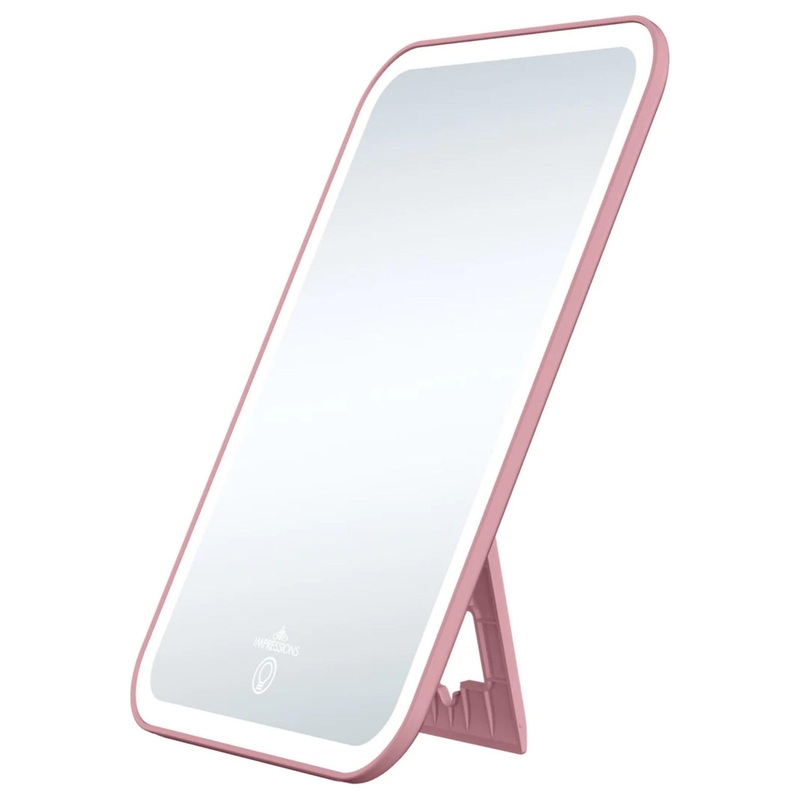 Impressions Vanity presents Icon Travel LED Makeup Mirror with 360 Degree Stand. Its design ambiance makes it an essential accessory every beauty enthusiast needs for flawless makeup application! Elevate your beauty routine with this stylish and functional travel lighted mirror for vanity. This LED mirror features glorious LED lighting that creates the perfect makeup ambiance. The dimmable lighting allows you to customize the illumination, ensuring you achieve the ideal look every time. Designed for convenience on the go, this small mirror for desk boasts a foldable 360 degree rotating stand, offering both vertical and horizontal standing options. Its compact rectangular shape makes it the perfect companion for your journeys, providing unparalleled ease wherever you are. The ultra slim lighted vanity mirror design with a round edge shape and a glorious, savvy, and smooth backside enhances its appearance in your hand and on any makeup desk making it an ideal gift for your loved ones. Never worry about power again with this elegant portable LED vanity mirror. It comes equipped with a reliable power system, allowing you to effortlessly do your makeup in any location at any time. Upgrade your beauty regimen with the perfect blend of style and functionality the Makeup Mirror that caters to your every need.