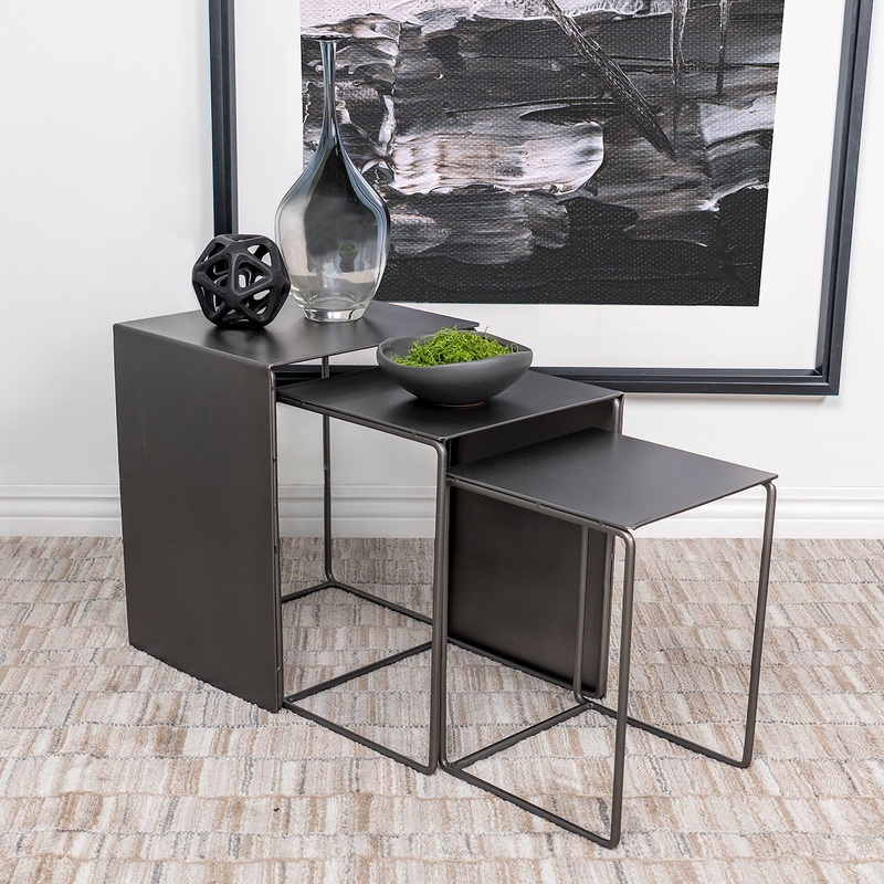 Simplicity of design shows itself to stellar effect in this three-piece industrial nesting table set. Offering versatility in your multi-functional living space, the three tables consolidate underneath the largest to minimize their footprint. Separate the