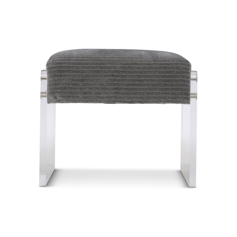 The Jasper ottoman’s upholstered seat appears to float in midair between two acrylic side panels. The design showcases a clearly modern comfort story.
